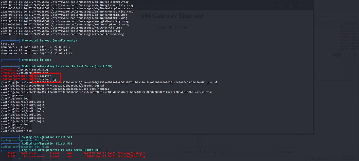 Now here’s the idea, we know that eric is a member of devs group and there a monitor file that is for root but there is rw permission for devs group. We can leverage this write permission to perform our exploit later.